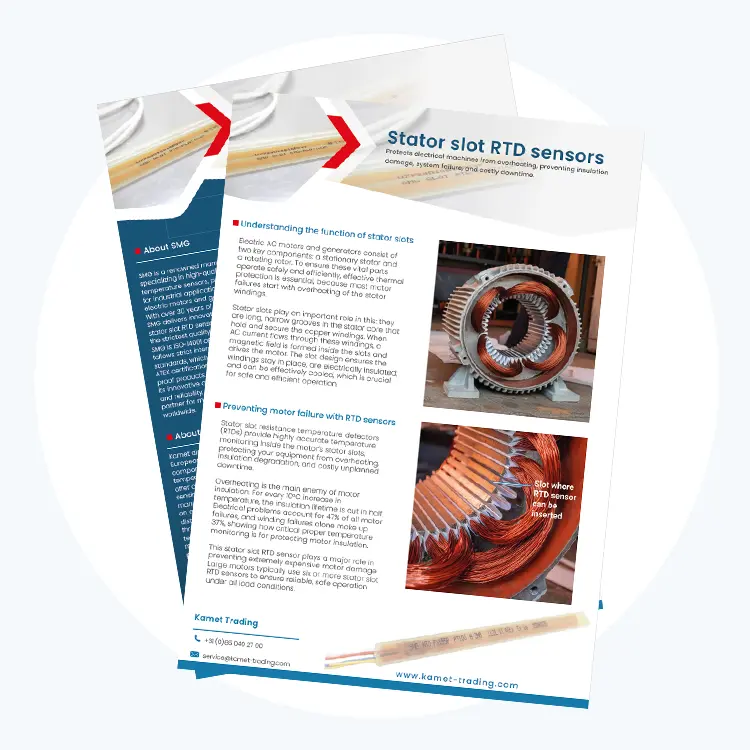 Our stator slot RTDs are manufactured by SMG in South-Korea. Trusted globally, SMG delivers high-performance thermal protection backed by proven Korean engineering. Most of their stator slot RTDs are delivered as custom-built solutions, tailored to the customer’s exact application and performance requirements.